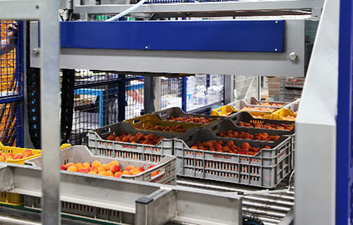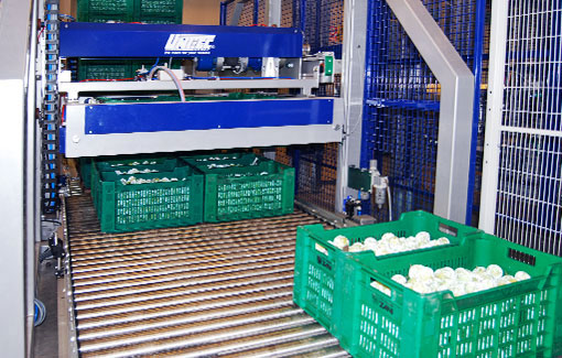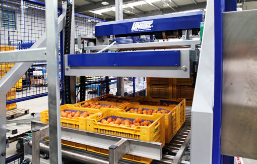 Депалетизация является первым этапом в автоматизированном процессе сортировки фруктов и овощей. Депалетизатор UNI DEP 200 предназначен для выгрузки ящиков, штабелированных на поддонах. Система подает верхний слой ящикв на роликовый конвейер, используя захват с самоцентрирующимися боковыми панелями, гарантирующий безопасное и надежное сцепление с ящиками.